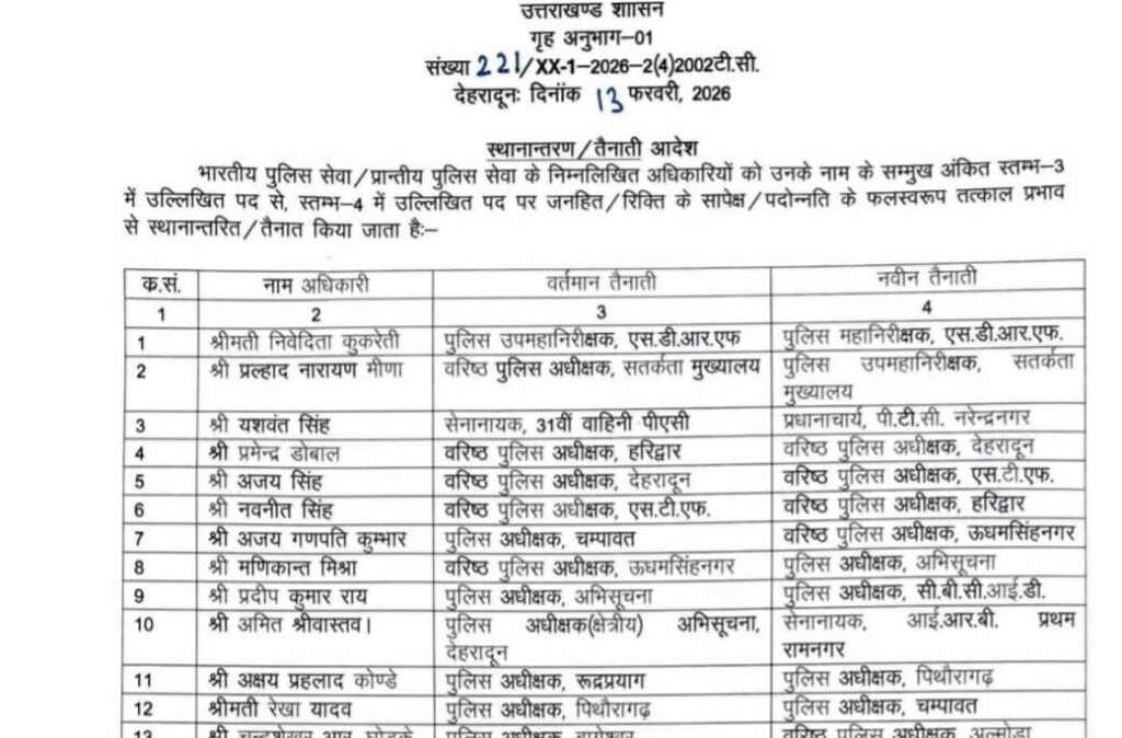 देहरादून, 13 फरवरी 2026उत्तराखंड शासन ने शुक्रवार को पुलिस प्रशासन में बड़े स्तर पर फेरबदल करते हुए भारतीय पुलिस सेवा (IPS) एवं प्रांतीय पुलिस सेवा (PPS) के कुल 20 अधिकारियों के स्थानांतरण व तैनाती आदेश जारी किए हैं। आदेश संख्या 221/XX-1-2026-2(4)2002टी.सी. के तहत जारी सूची में कई महत्वपूर्ण जिलों और रणनीतिक इकाइयों के प्रमुख बदले गए हैं।